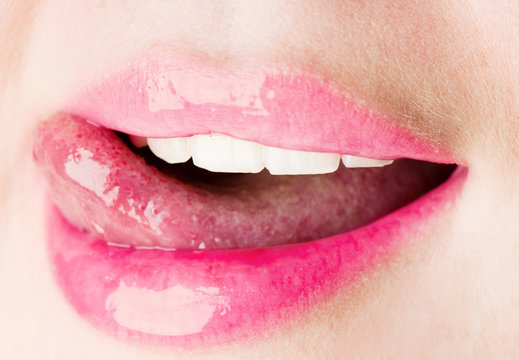 young female licking her pink lips