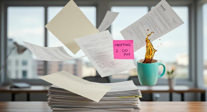 Coffee cup with sticky notes on wooden table for productivity concepts