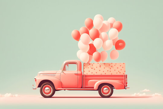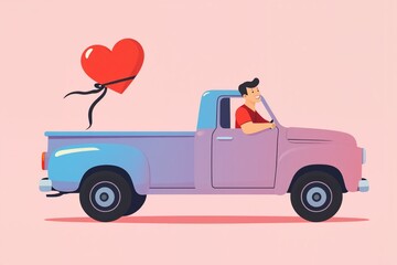 A cheerful man drives a pastel-colored pickup truck, with a red heart balloon floating above the bedperfectly capturing love and romance on Valentines Day!