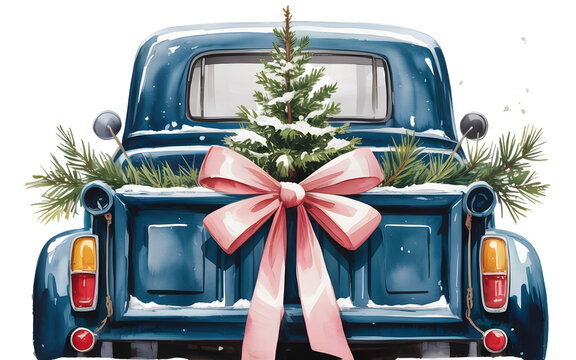 Vintage blue pickup truck decorated for christmas with a tree and pink bow