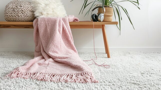 A pink plush blanket with fringes on the white carpet in a modern interior