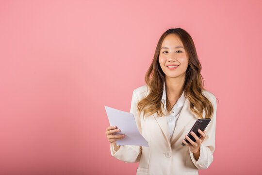 Portrait of Asian happy young woman smile holding paper calculating bills on hand and mobile phone for payment QR code, female person holding bill studio shot isolated on pink background