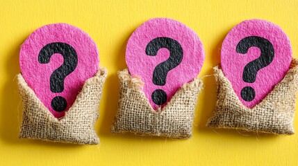 Pink question marks in burlap sacks on a yellow background.