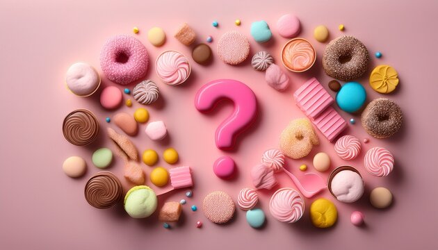 colorful assortment of sweets and treats arranged around a pink question mark on a pastel background