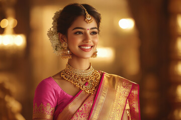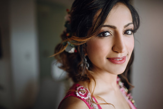Portrait of beautiful Hindu bride in pink sari getting ready for the ceremony in hotel room