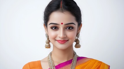 Woman wearing a yellow and pink sari with gold earrings and a red dot on her forehead