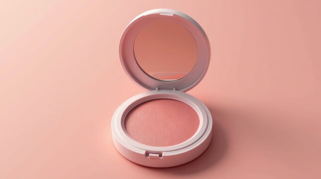 close-up of a blush compact featuring a soft pink shade and a mirror, showcasing its elegant design and texture