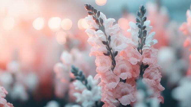A picturesque capture of white and pink snapdragons set against a softly bokeh background, creating a serene, dreamy, and aesthetically unique floral composition.