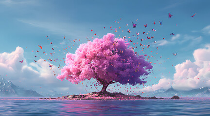 A pink tree full of flowers, standing on the edge of an ancient cliff, with sunlight shining through its leaves and petals falling to form splashes of light in front of it. Generative AI.