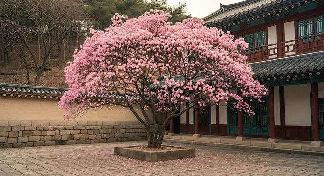Blooming pink tree in courtyard of traditional Korean building blossoms flowers