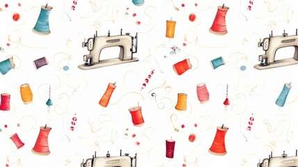 Creative sewing and tailoring essentials: machine, scissors, needles on seamless white surface