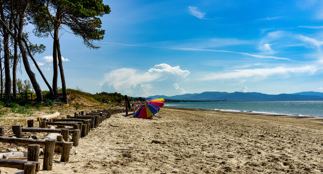 Panorama of the beach at Sterpaia Coastal Park in Piombino, Livorno, Tuscany, Italy
