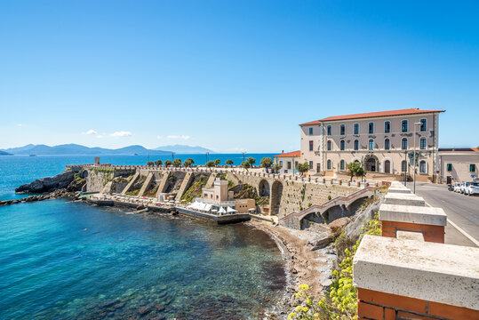 Picturesque view on Piombino town and beach from piazza Bovio, Tuscany