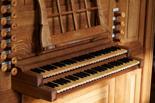 A large pipe organ in a church. Suitable for religious or music-related designs