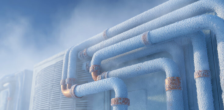 Broken pipe on a street with water leaking and icicles forming. Concept of frozen water causing burst plumbing during winter.