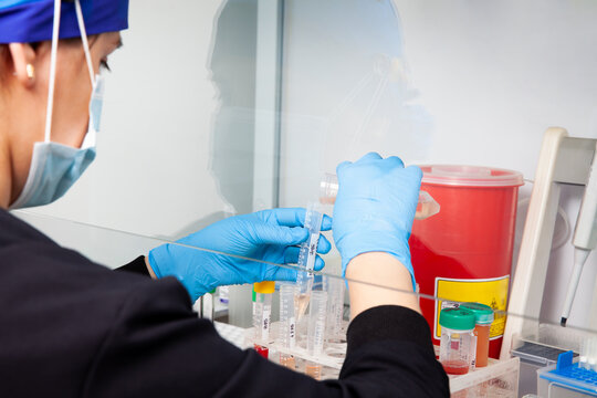 Young female scientist working in a safety laminar air flow cabinet at the laboratory