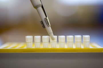 Blue and pink pipette tips filling test tubes with blue liquid in a lab closeup