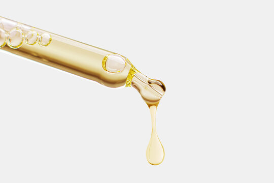 Cosmetic pipette with a falling drop of gold color on a light background.