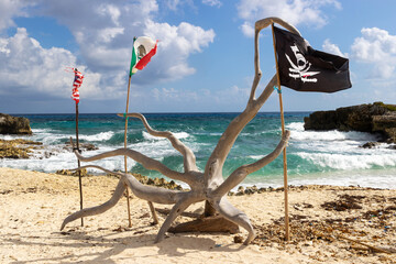 Flags of Mexico and the United States blow in the wind on a large piece of wood shaped like an octopus alongside a skull and crossbones pirate flag on a sandy beach surrounded by turquoise ocean water