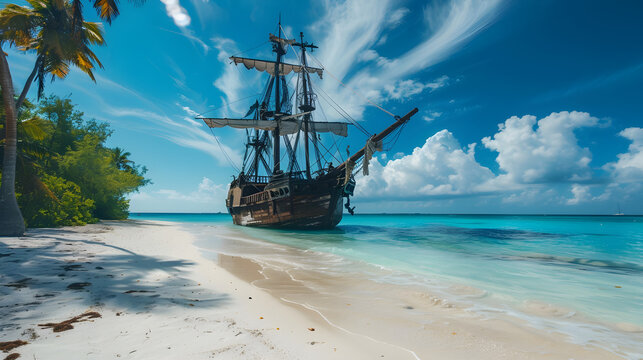A pirate ship lies abandoned on a sandy beach, surrounded by palm trees and rocks.