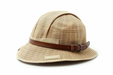 A tan pith helmet with a wide brim, leather chinstrap, and small brass knob atop.  It casts a subtle shadow on a light gray background