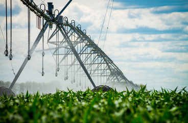 Agricultural watering pivot irrigation system on a corn field at sunset