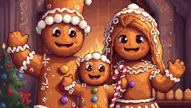 Cozy pixel art gingerbread family waving by fireplace holding candy cane and gumdrops