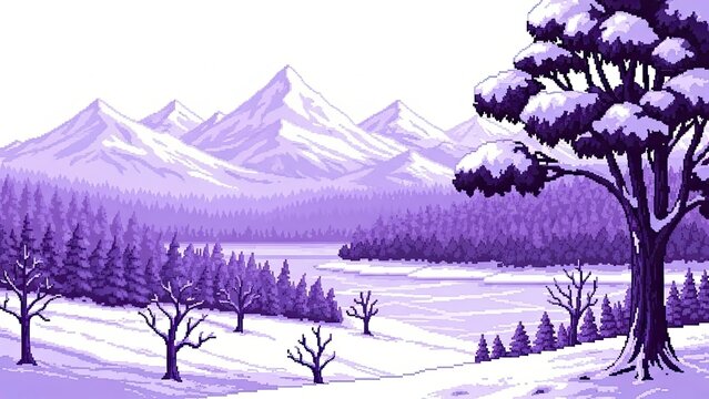 Snaking frozen river and icy stream in pixel art winter forest, minimalist retro landscape