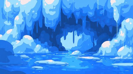 Pixel Art Ice Cave With Icicles Reflecting In Water And Bright Light Entrance