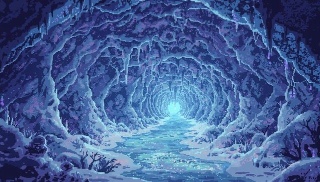 Glowing pixel-art frozen cavern with icicles, reflective ice floor and night sky depth
