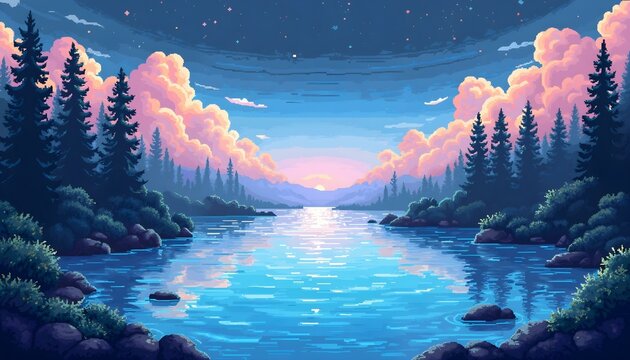 Retro pixel art depicting a sunset over a river and mountains, perfect for a game landscape background
