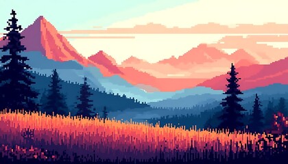 View of the distant mountains and sunset sky, plants and pine trees in the foreground, pixel image, 2d