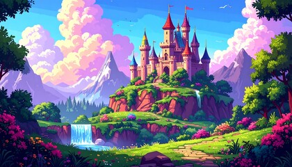 Enchanting nature scene in pixel art with waterfall and verdant forest