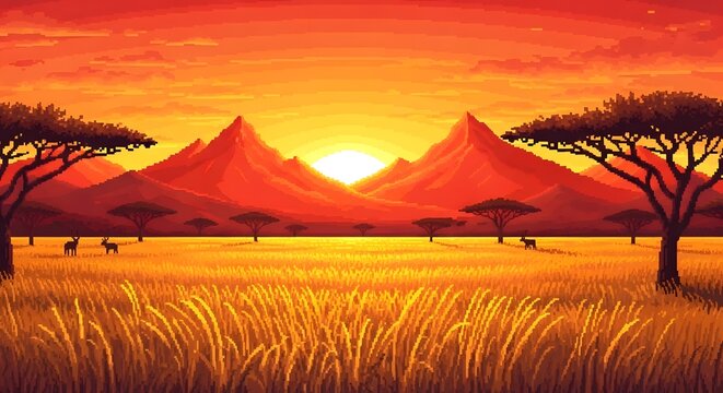 Serene pixel art landscape with evergreen trees and layered mountains reflecting on a tranquil lake, shaded by soft, golden clouds.