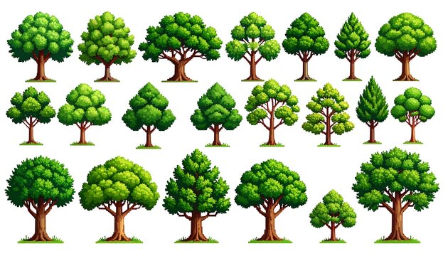 A vibrant and colorful pixel art illustration of a dense forest with trees in various shapes, sizes, and autumnal colors