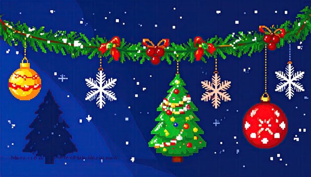 Retro pixel art Christmas garland with festive ornaments and snowflakes.
