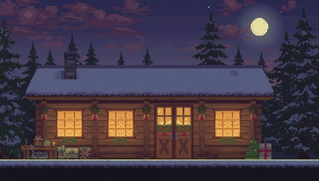 Cozy pixel art winter log cabin glowing lights snowy roof presents under full moon night