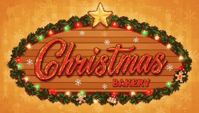 Retro pixel-art christmas bakery wooden sign glowing garland festive lights gingerbread