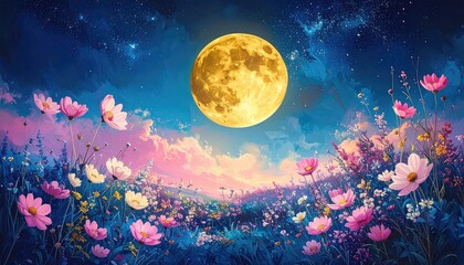 Pixelated Cosmos Flowers Under A Full Golden Moon With Starry Night Sky In A Field Of Wildflowers At Dusk