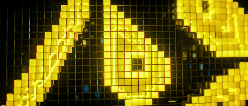 Bright yellow glowing geometric grid with pixelated blocks and illuminated abstract shapes, creating a vibrant, futuristic, and digital composition.