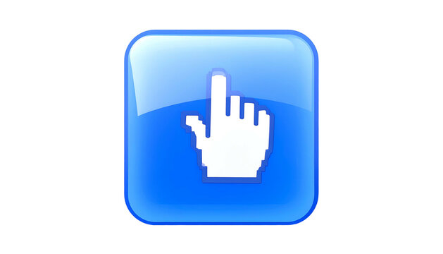 A square, glossy blue button with a pixelated white hand cursor