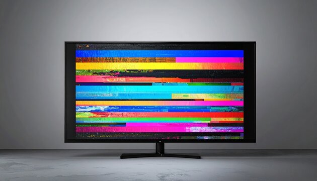 Flat screen TV displaying horizontal interference lines, pixelated signal loss, damaged display panel with color bleeding