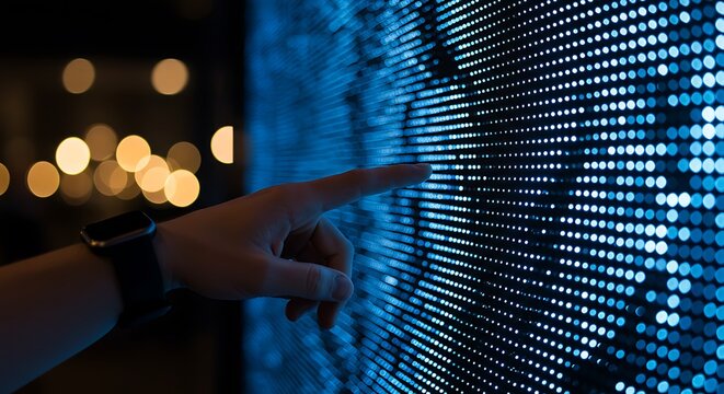 A pixelated green hand hovers over a digital surface of binary code, symbolizing online interaction and technological advancement