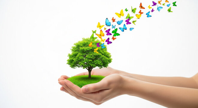 Close-up of hands holding a small green tree from which colorful pixelated butterflies are emerging, isolated on a clean white background in a conceptual design.