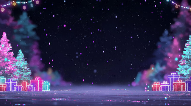 Glowing pixel art tree illuminating navy night sky with pastel ornaments and starry pixels