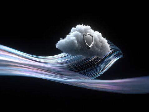 Pixelated Shield Over Cloud on Iridescent Data Stream