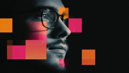 Close-up profile of a man, wearing glasses, with vibrant, colorful pixelated squares layered over his face