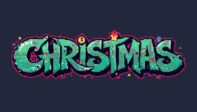 Retro pixel christmas typography with crown, neon pink halo and festive eight-bit ornament
