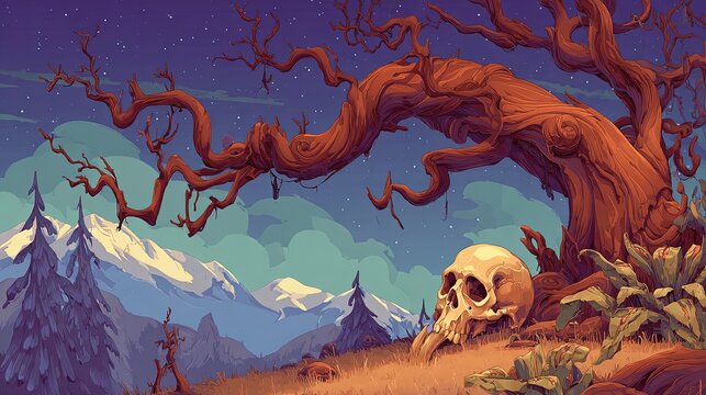 Pixelated Landscape Scene With Dead Tree And Skull