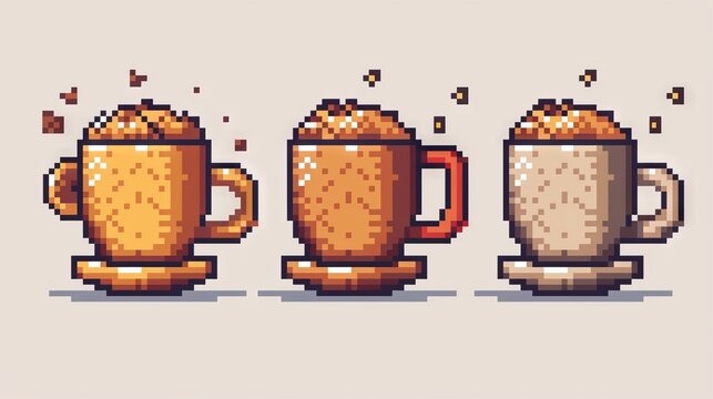 Pixel art of three coffee cups with steam rising, each in different shades of brown and beige